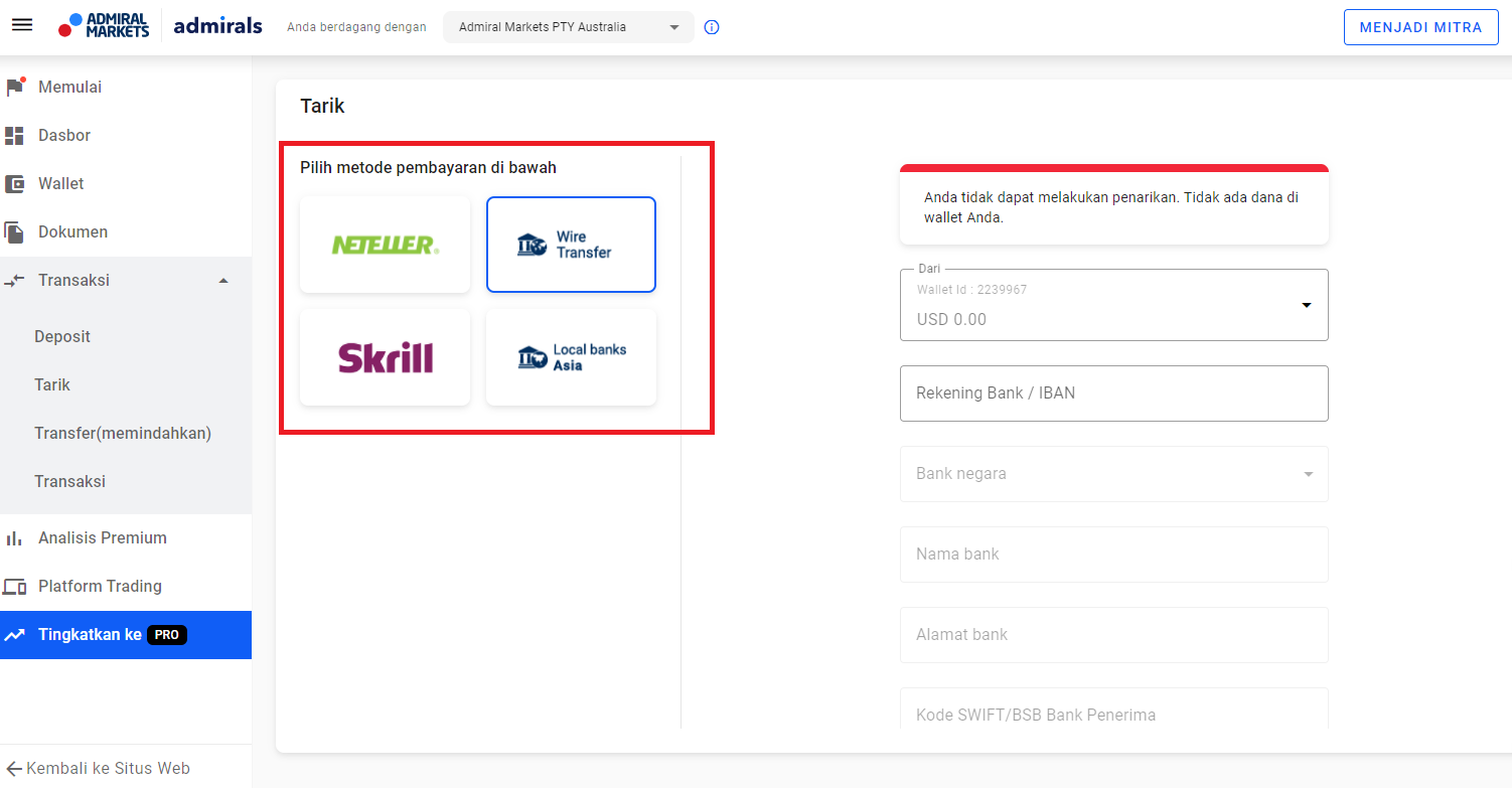 Cara Upgrade Akun Top Up. Tahap 2 adalah penarikan dana dari saldo di akun broker anda ke rekening bank anda klik tombol withdraw yang ada di menu utama bukan yg di metaid Pilih meta id anda pilih exchanger Erwin Saeful Bandung lalu masukkan nominal WD nya minimal USD 10 dan. Pilih metode pembayaran yang Anda sukai lalu klik tombol Tarik.
